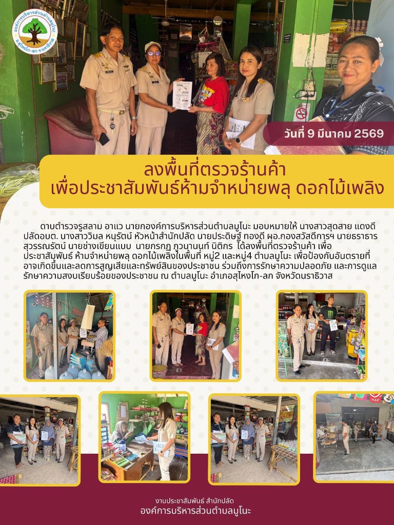 วันที่ 9 มีนาคม 2569 ดาบตำรวจรูสลาม อาแว นายกองค์การบริหารส่วนตำบลมูโนะ มอบหมายให้ นางสาวสุดสาย แดงดี ปลัดอบต. นางสาววิมล หนุรัตน์ หัวหน้าสำนักปลัด นายประดิษฐ์ ทองดี ผอ.กองสวัสดีการฯ นายธราธาร สุวรรณรัตน์ นายช่างเขียนแบบ นายกรกฏ ภูวนานนท์ นิติกร ได้ลงพื้นที่ตรวจร้านค้า เพื่อประชาสัมพันธ์ ห้ามจำหน่ายพลุ ดอกไม้เพลิงในพื้นที่ตำบลมูโนะ เพื่อป้องกันอันตรายที่อาจเกิดขึ้นและลดการสูญเสียและทรัพย์สินของประชาชน ร่วมถึงการรักษาความปลอดภัย และการดูแลรักษาความสงบเรียบร้อยของประชาชน ณ ตำบลมูโนะ อำเภอสุไหงโก-ลก จังหวัดนราธิวาส