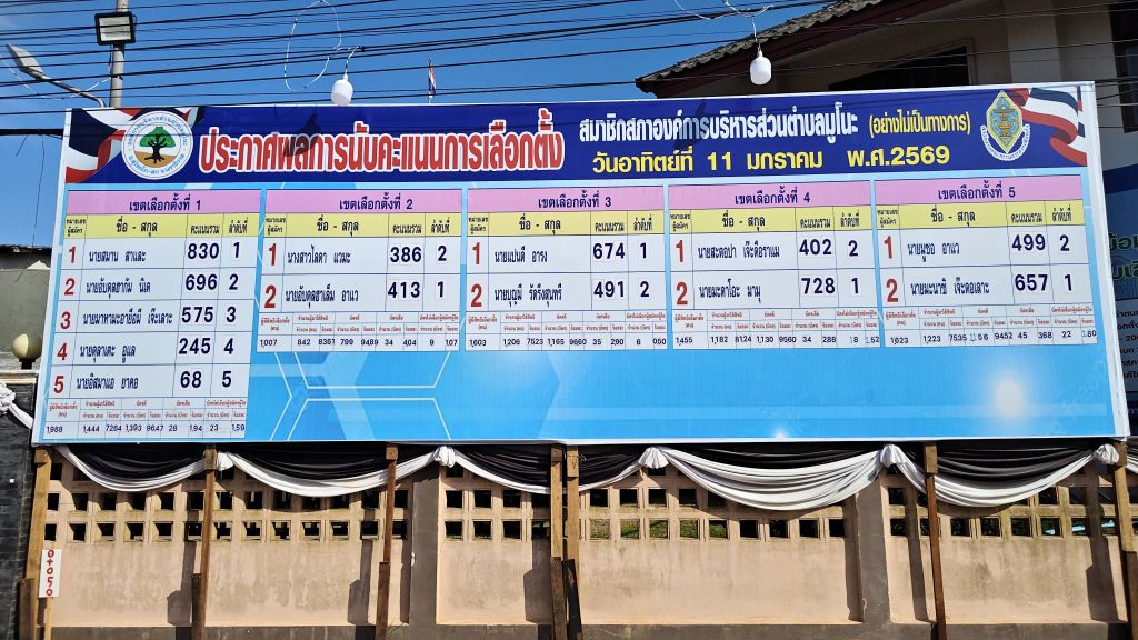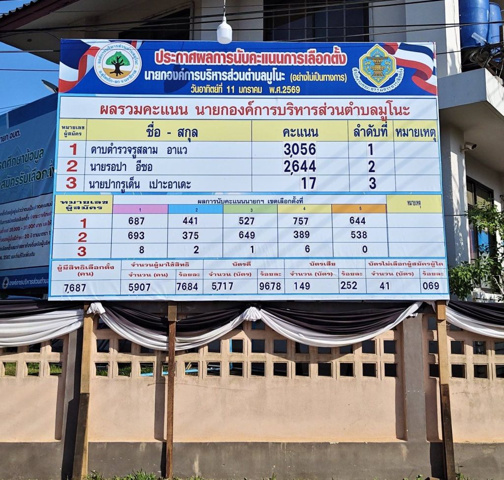 ผลการนับคะแนนการเลือกตั้ง (อย่างไม่เป็นทางการ)สมาชิกสภาองค์การบริหารส่วนตำบลมูโนะและนายกองค์การบริหารส่วนตำบลมูโนะ