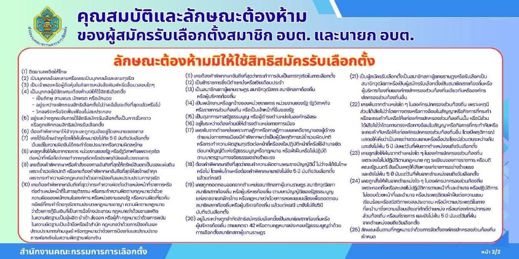 ประชาสัมพันธ์ คุณสมบัติและลักษณะต้องห้าม ของผู้สมัครรับเลือกตั้งสมาชิกสภาองค์การบริหารส่วนตำบล และนายกองค์การบริหารส่วนตำบล เพื่อให้ผู้สมัครรับเลือกตั้งได้ทราบ และสำรวจคุณสมบัติ ลักษณะต้องห้ามของตนเองให้ครบถ้วนก่อนสมัคร ผู้ที่ประสงค์จะสมัครเลือกตั้ง สามารถตรวจสอบคุณสมบัติของตนเองได้ตามรายละเอียดนี้ได้ 18/11/2025 ประกาย ย Leave a comment ข่าวประชาสัมพันธ์