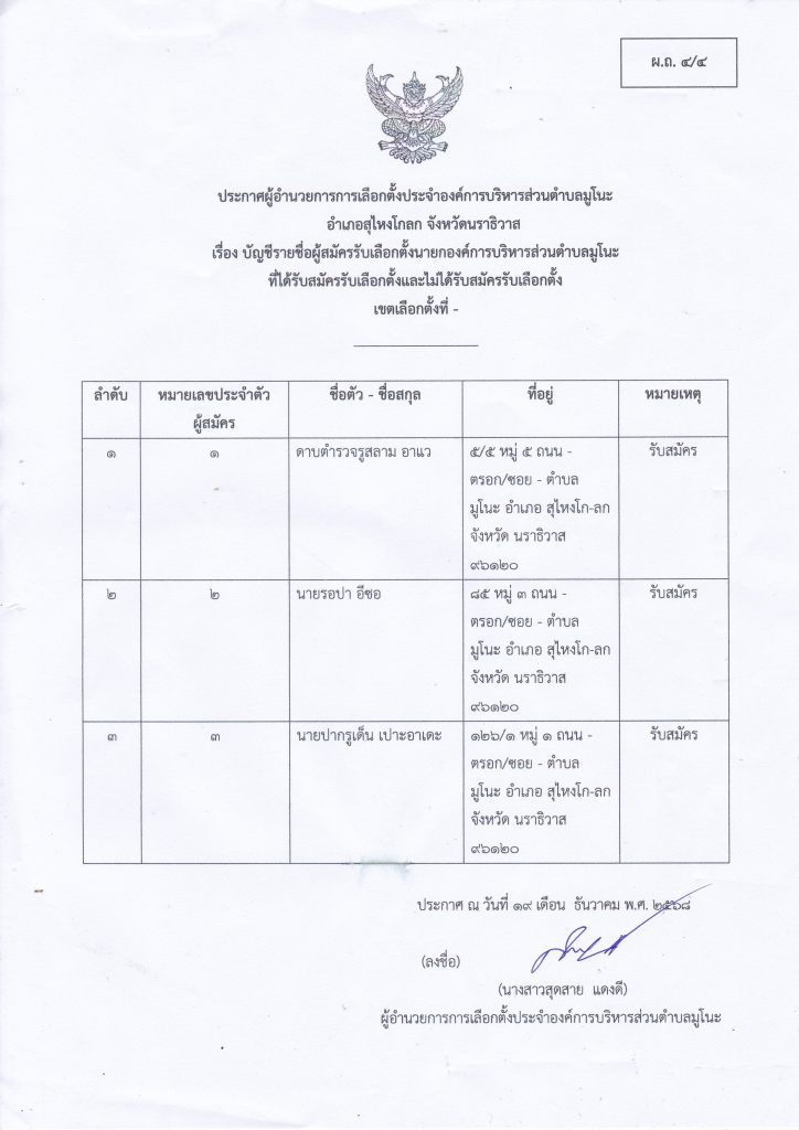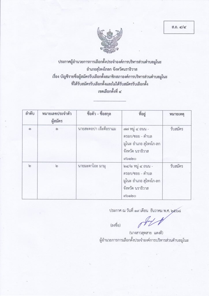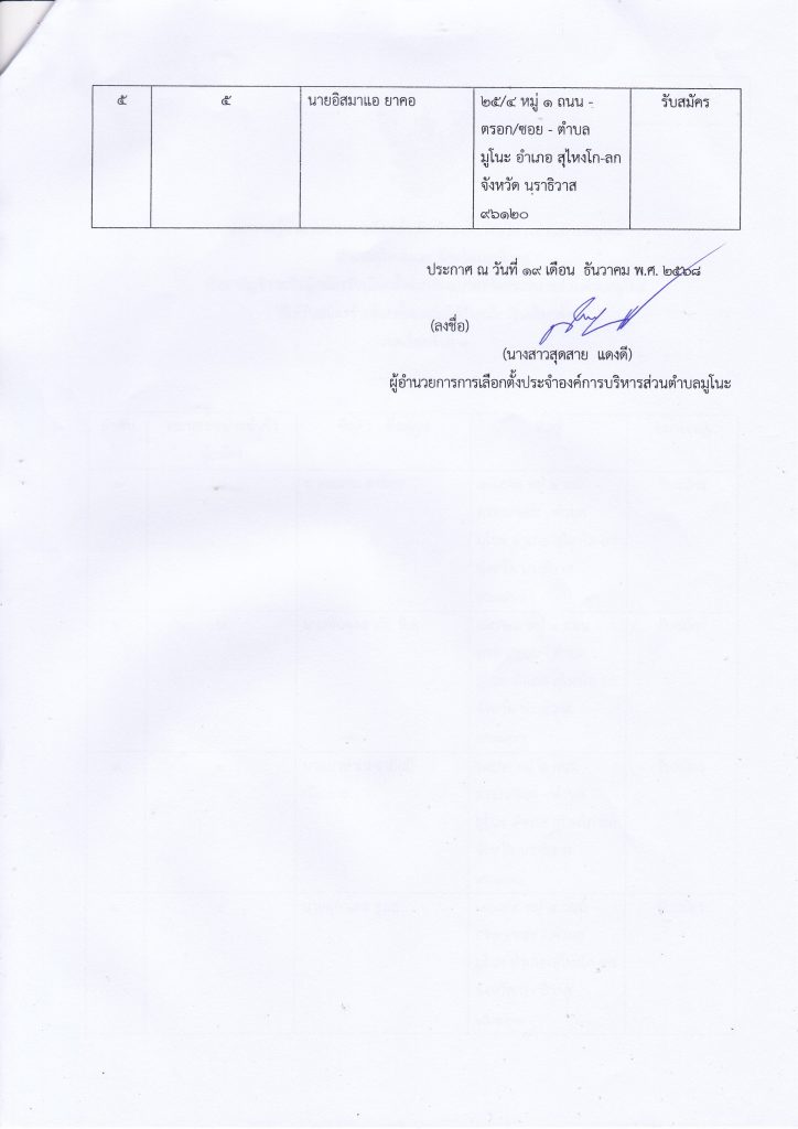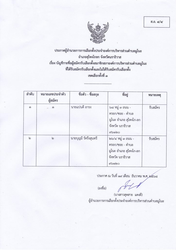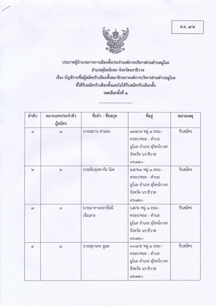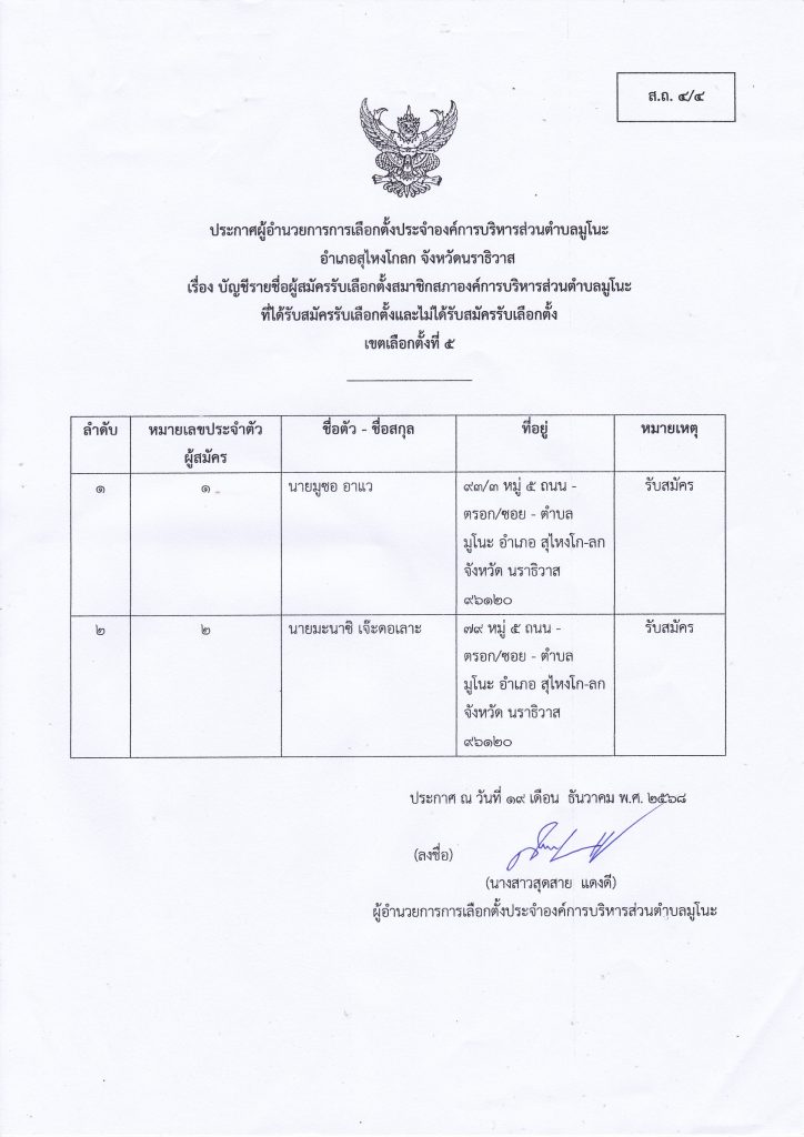 ประกาศผู้อำนวยการการเลือกตั้งประจำองค์การบริหารส่วนตำบลมูโนะ รายชื่อผู้สมัครรับเลือกตั้งสมาชิกสภาองค์การบริหารส่วนตำบลมูโนะ เขตเลือกตั้งที่ 1 – 5