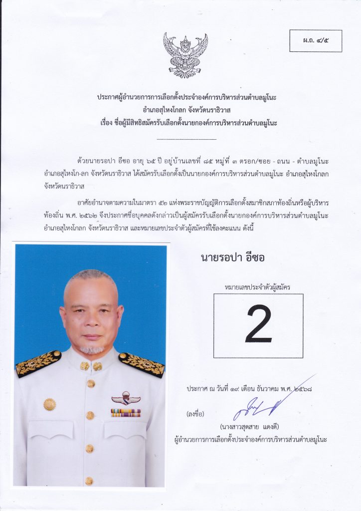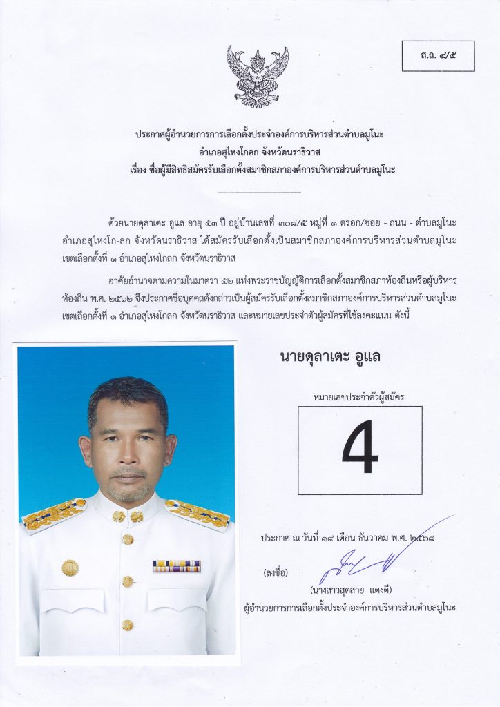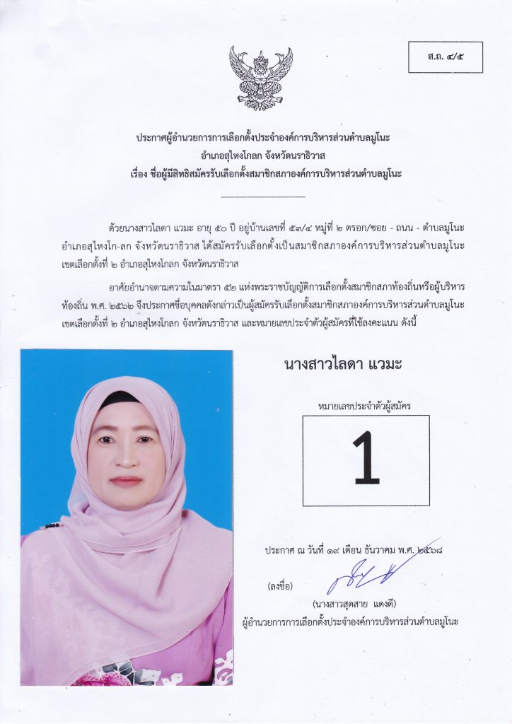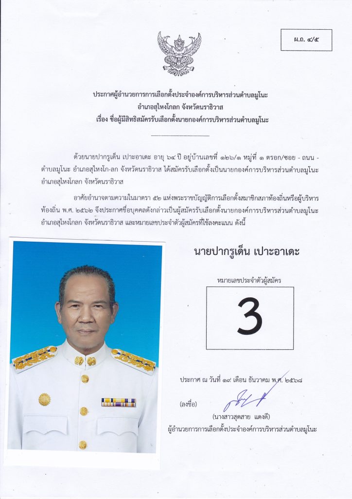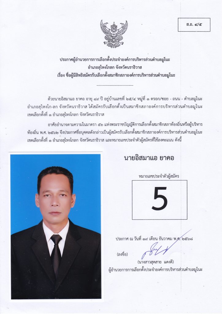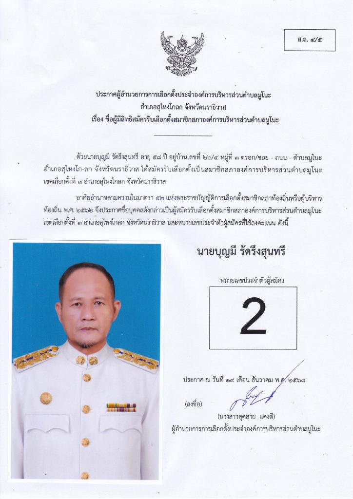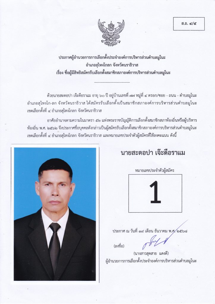 ประกาศผู้อำนวยการการเลือกตั้งประจำองค์การบริหารส่วนตำบลมูโนะ รายชื่อผู้สมัครรับเลือกตั้งสมาชิกสภาองค์การบริหารส่วนตำบลมูโนะ เขตเลือกตั้งที่ 1 – 5