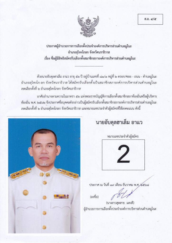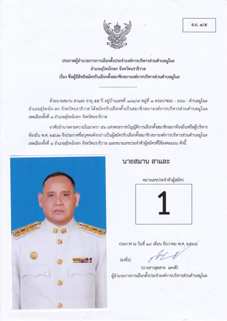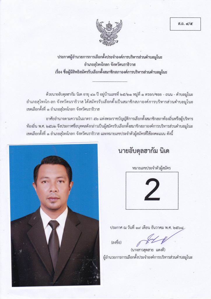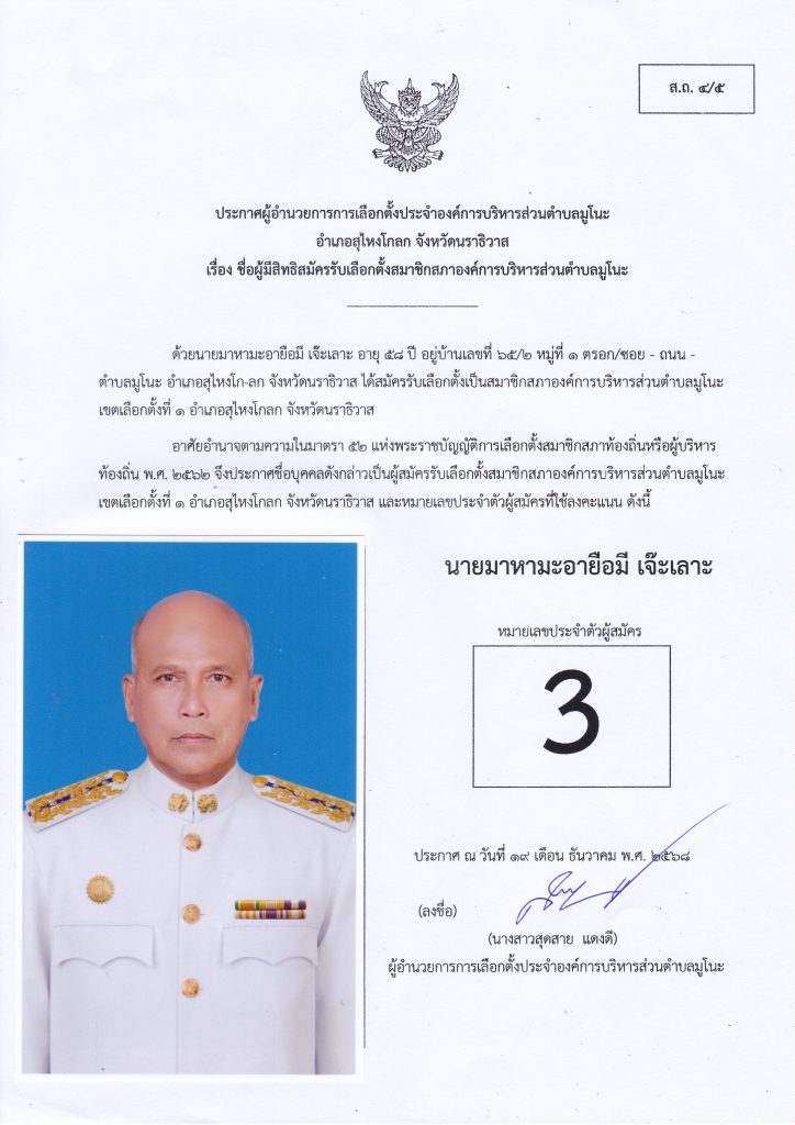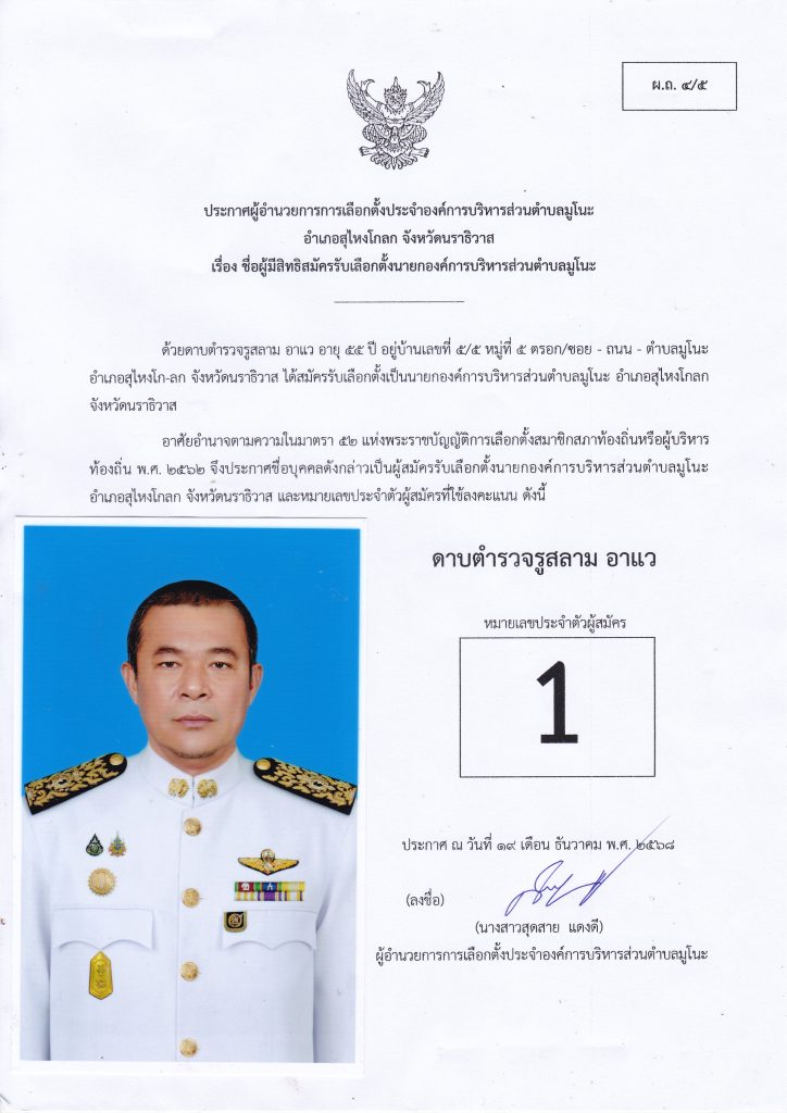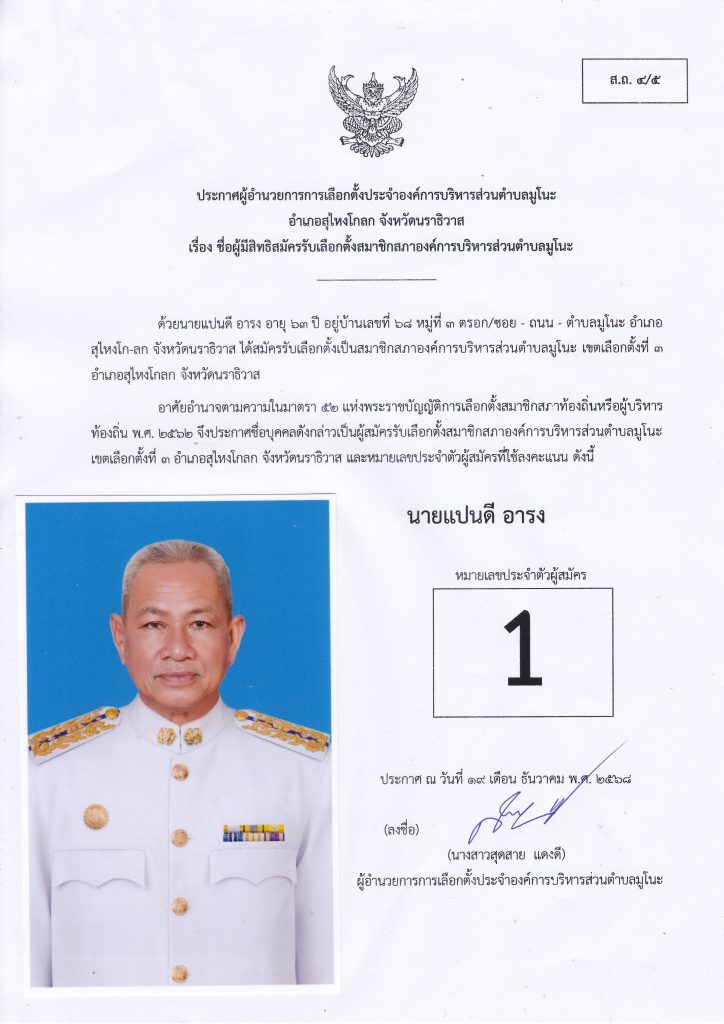 ประกาศผู้อำนวยการการเลือกตั้งประจำองค์การบริหารส่วนตำบลมูโนะ รายชื่อผู้สมัครรับเลือกตั้งสมาชิกสภาองค์การบริหารส่วนตำบลมูโนะ เขตเลือกตั้งที่ 1 – 5
