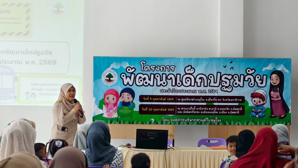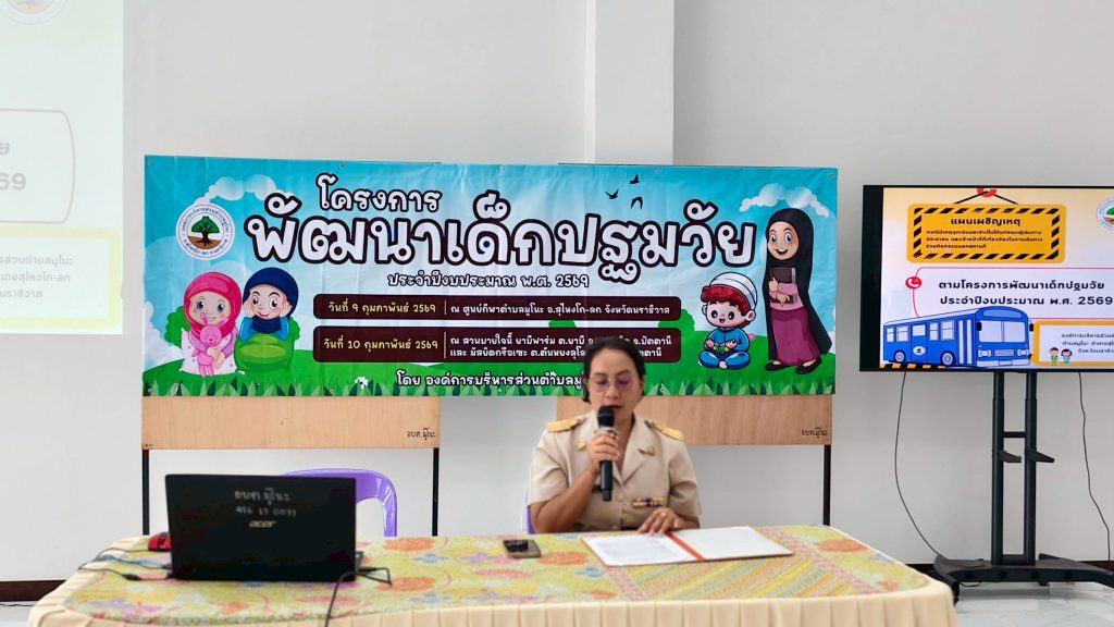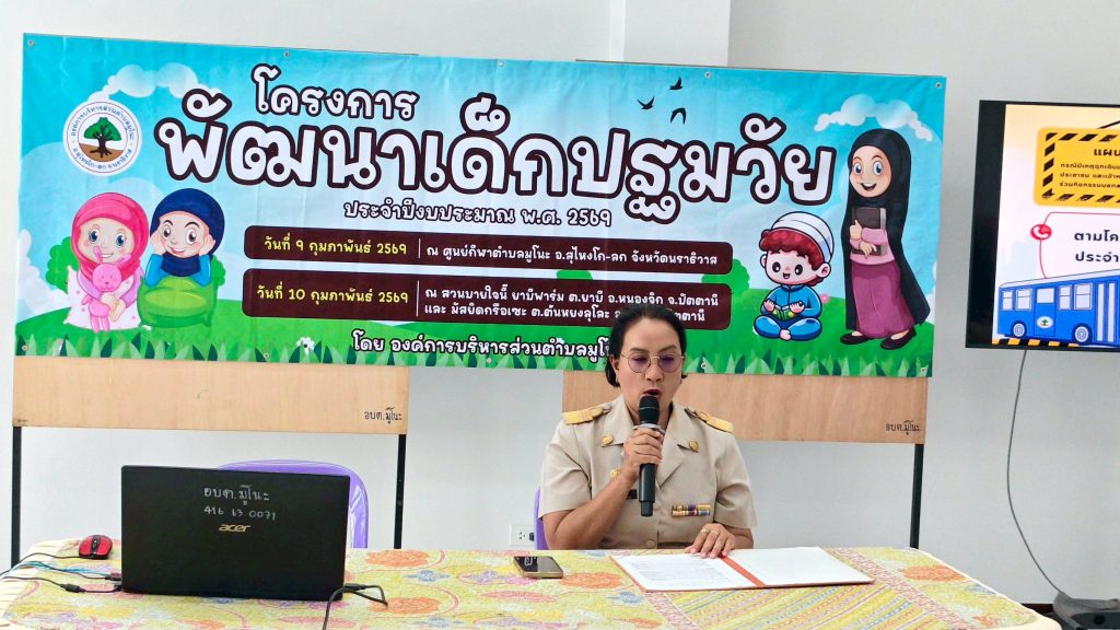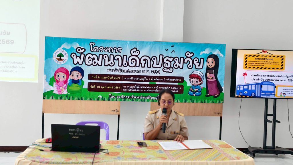วันที่ 9 กุมภาพันธ์ 2569 เวลา 09.00 น. นางสาวสุดสาย แดงดี ปลัดอบต.มูโนะ เป็นประธานกล่าวเปิดโครงการพัฒนาเด็กปฐมวัย 2569 ซึ่ง นางซูซานา อาแวตะโละ ผอ.กองการศึกษา ได้กล่าวรายงานวัตถุประสงค์ ซึ่งมี หัวหน้าส่วนราชการ นักวิชาการศึกษา เจ้าพนักงานธุรการ ร่วมโครงการในครั้งนี้ ณ ที่ว่าการองค์การบริการส่วนตำบลมูโนะ หมู่ 5 ตำบลมูโนะ อำเภอสุไหงโก-ลก จังหวัดนราธิวาส
